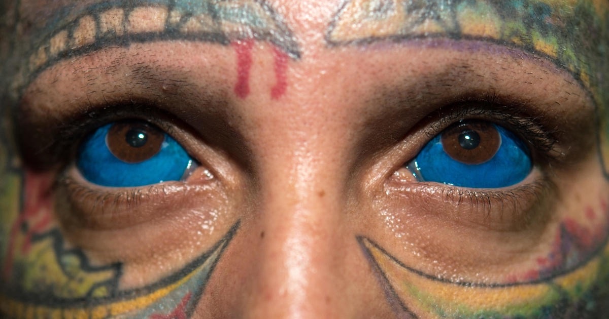 Тату глазного яблока (или склеральная татуировка) - один из самых экстремальных видов модификации тела. О процессе нанесения и об основных рисках - в этой статье. Техника нанесения склеральной татуировки заключается во впрыскивании чернил на водной основе с помощью тончайшей иглы между двумя слоями глаза - склерой и конъюнктивой. Склера - это прочная оболочка, состоящая из коллагеновых волокон. Она покрывает роговицу и защищает глаз от внешних воздействий. Конъюнктива - это прозрачная слизистая оболочка, покрывающая всю заднюю поверхность верхнего и нижнего век и переднюю поверхность глазного яблока вплоть до роговицы, которая соединяет веки с глазным яблоком. Задача мастера и состоит во введении чернил между этими двумя слоями глаза. Тату на глазных яблоках - синие чернила / Google photos После впрыскивания, чернила постепенно распределяются на глазном яблоке, окрашивая его. Процесс нанесения татуировки на глазные яблоки может занять несколько процедур, в промежутках между ними мастер