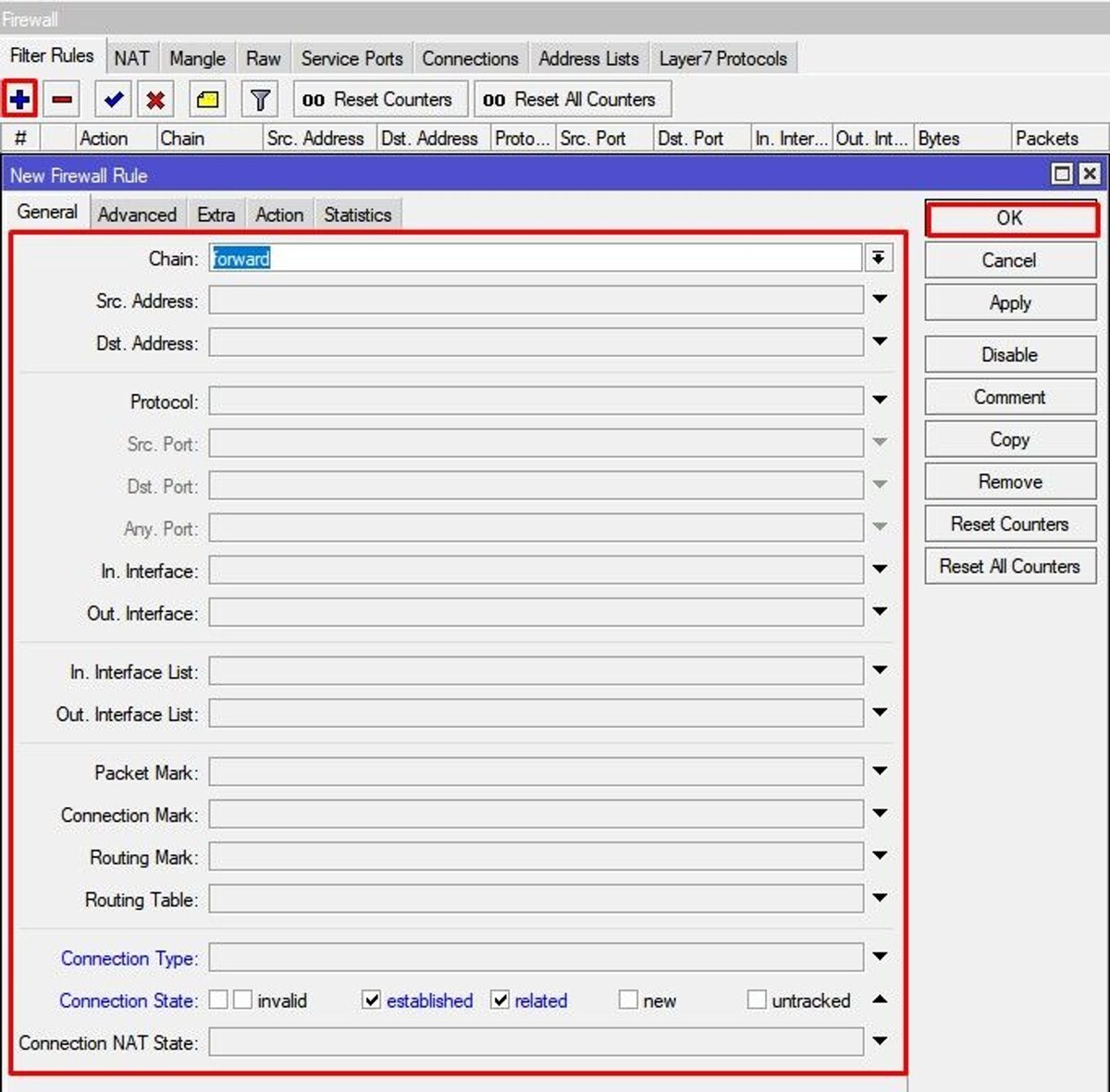 Разрешение установленных и связанных подключений для входящего и проходящего трафика