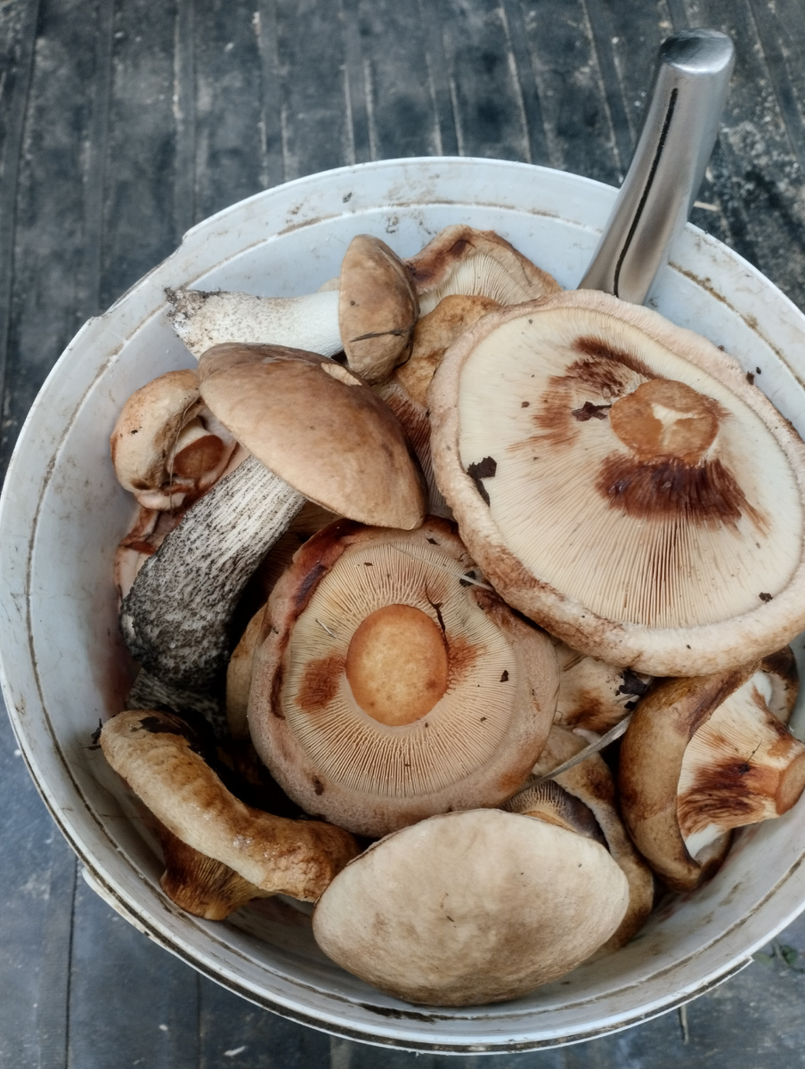 Добрый воскресный день всем 😍! Вчера вечером договорились с мужем,что утром- пораньше - доедем до леса. Но в пол третьего начался такой сильный дождь,что я благополучно проспала до пол восьмого. Встала,а муж уже разобрался со скотиной,коз подоил,всех перегнал в загон,с птицей разобрался и уже пьёт кофе. Быстро собрались и поехали. У мужа кошелка,у меня пяти литровое ведёрко . Решили сначала по благородным грибам. Нашли три белых и три подосиновика,немного подберёзовиков . Попалась замечательная семейка свинухов,но это уже не благородные 🤣но все равно взяли . Это мое ведёрко и у мужа в кошелке примерно так же. Из ведра все переложили в кошелку и решили заехать в другое место . Кошелку оставили в машине ,а сами пошли с моим ведёрком. И за двадцать минут набрали: Все выложили в кошелку и ещё раз в лесок: А это общий результат нашей тихой охоты за полтора часа вместе с дорогой. Ещё немного набрали себе для жарки. Грибы завезли к родителям . У нас договоренность : мы грибы собираем ,а мам