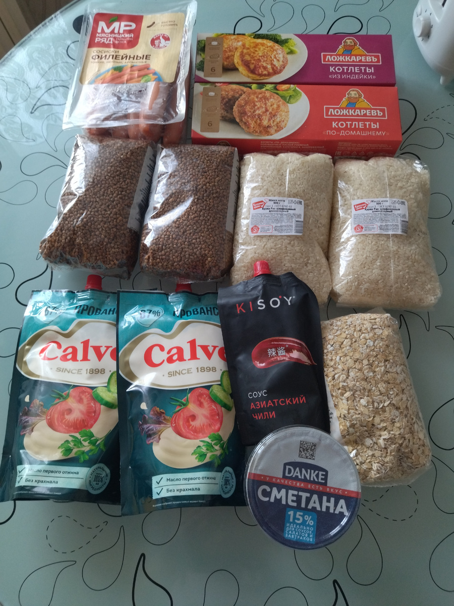 Да и вообще растратная неделя вышла. Общая сумма потраченных за неделю денег на продукты получилась 4468 рублей. С одной стороны, это не много. Но с другой - кое-что можно было бы и не покупать. Ну да ладно, чего уж теперь, не пропадет, съедим. Сегодняшняя покупка выглядела вот так Гречки и овсянки дома не было совсем, риса длиннозерного тоже. Майонез по приятной цене, котлеты и сосиски очень выручат в ближайшее время, ведь сейчас много сил и времени уходит на одно важное и нужное дело. Вообще бы надо домашних полуфабрикатов наготовить, да что-то времени никак не найду 🙈 Вечером дочку отправила за хлебом, она еще себе какую-то слойку прихватила. С подсчётами и покупками закончила, теперь немного расскажу про еду на выходных. Завтраки. В субботу это была овсяная каша с голубикой. В воскресенье пожарила те самые дешевые яйца с беконом. Бледненькие они, непривлекательные. Но для меня это вообще не принципиально. К кофе оба дня были бутерброды - с колбасой, творожным сыром и закус