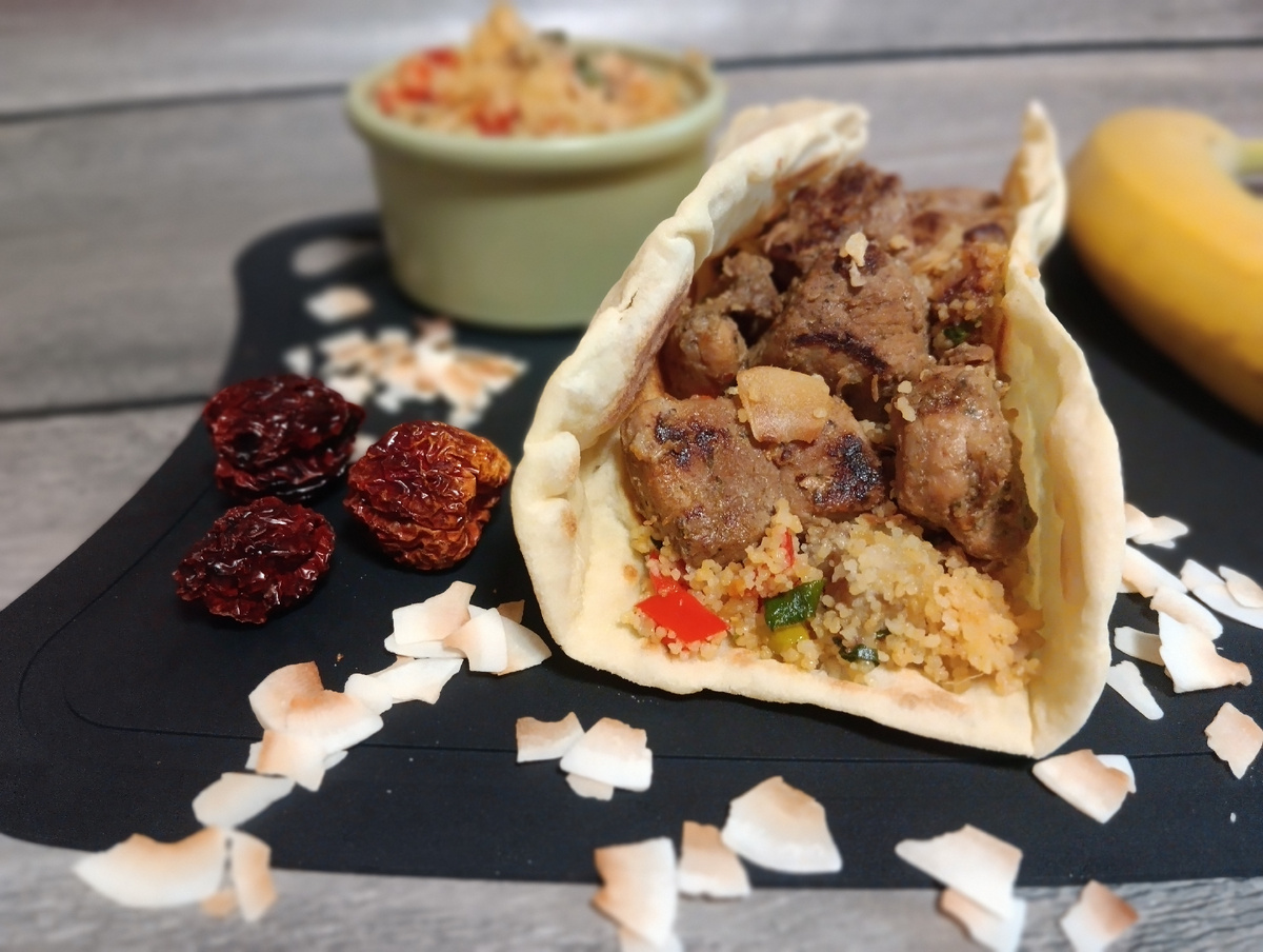 На свежий наан выложите кускус с фруктами и куски свинины с небольшим количеством соуса от тушения.