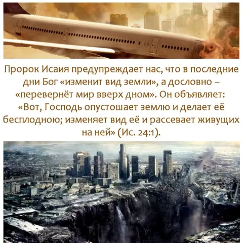 Согласная словам пророка Исаи в последние дни Бог «изменит вид земли». Если быть дословным «перевернет мир вверх дном». «Вот, Господь опустошает землю и делает её бесплодною; изменяет вид её и рассевает живущих на ней» (Ис. 24:1). Если верить эту пророчеству, то суд на землю обрушится внезапно, "как тать в ночи". А это значит, что всё на ней изменится за один час. За столь короткий промежуток времени вся Вселенная станет свидетельницей очень скоро разрушения города и всей страны в целом. После этого мир уже никогда не будет прежним. Читайте молитву о помощи, сохранения мира к святому Иоанну Кронштадтскому. Текст её найдет здесь. Проходите по ссылке, сохраняйте у себя: https://t.me/molitvaikona/4616. И нет основания спорить, что его пророчество касается именно нашего времени, нашего поколения. Не один толкователь Библии это доказывает, словом грядёт внезапный Суд. И Священное Писание очень убедительно указывает на то, что он уже у дверей. Дышит рядом. Можно, конечно, возразить, и начат