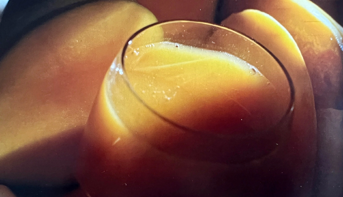 Вымойте и очистите фрукты. Приготовьте соки по отдельности и смешайте в стакане.