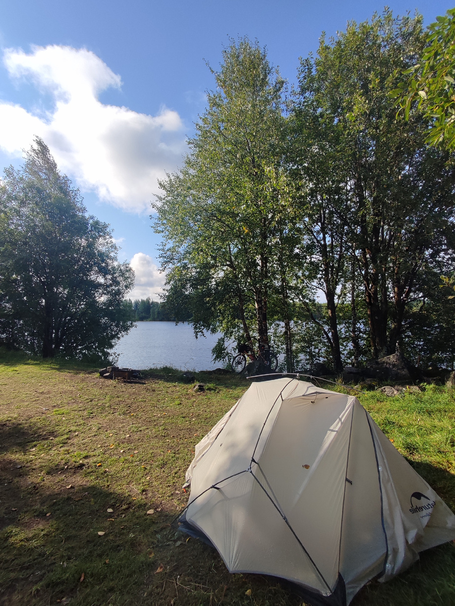 Со вчерашнего вечера занимался дождь. К ночи он так расшумелся, что стало тревожно. Новая палатка в таких условиях ещё не проверялась, и было не ясно выдержит ли она этот натиск. Опасения мои были не напрасны и у одного вентиляционного окошка со временем начали сочиться капли, не часто, но всё же срывались они с потолка и падали на спальник. Сильной опасности они не представляли, но ощущение полной защищённости в сильный дождь теперь нет. К утру погода начала налаживаться и чуть позже обычного я принялся ко всем своим утренним процедурам. Позавтракать, правда, решил в кафе на заправке, чтоб взять оттуда с собой немного хлеба. За сегодня до цивилизации я, скорее всего не доеду. Рядом на берегу в машине остановилась ночью молодая пара. Они тоже проснулись и начали сборы. Я на удачу подошёл спросить хлеба и у них. Ребята охотно поделились со мной несколькими ломтями и сыром. Вот и я начинаю осваивать навык обращаться за помощью к людям. На заправке заказал себе борщ, и ещё неско