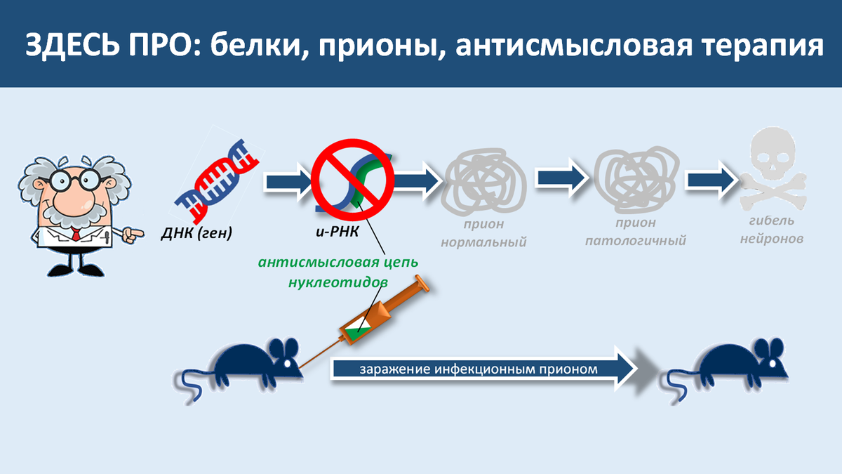Напугала я вас статьёй про прионы? Сама боюсь. Кому же хочется, чтобы его головной мозг стал похож на швейцарский дырявый сыр? И самое ужасное, что лекарства от этой напасти нет! Пока нет. Однако поиски его ведутся. Группа учёных из университетов Оксфорда, Массачусетса и Гарварда попробовали справиться с развитием прионного заболевания. Информация о результатах этой попытки была опубликована в журнале Nucleic Acids Research издательства Оксфордского университета 4 ноября 2020 года. Известно, что один из ведущих специалистов в этой научной группе сам страдает от прионного заболевания, что безусловно добавило драматизма в работу всей команды. В качестве подопытного организма были выбраны мыши, которых сначала заражали инфекционными прионами, а потом проверяли на них действие новой терапии. Напомню, что прионы - это на сегодняшний день единственные известные инфекционные агенты, не являющиеся организмами. Они - не вирусы, не бактерии, не грибы, не простейшие. Они - белки. Молекулы. Всег