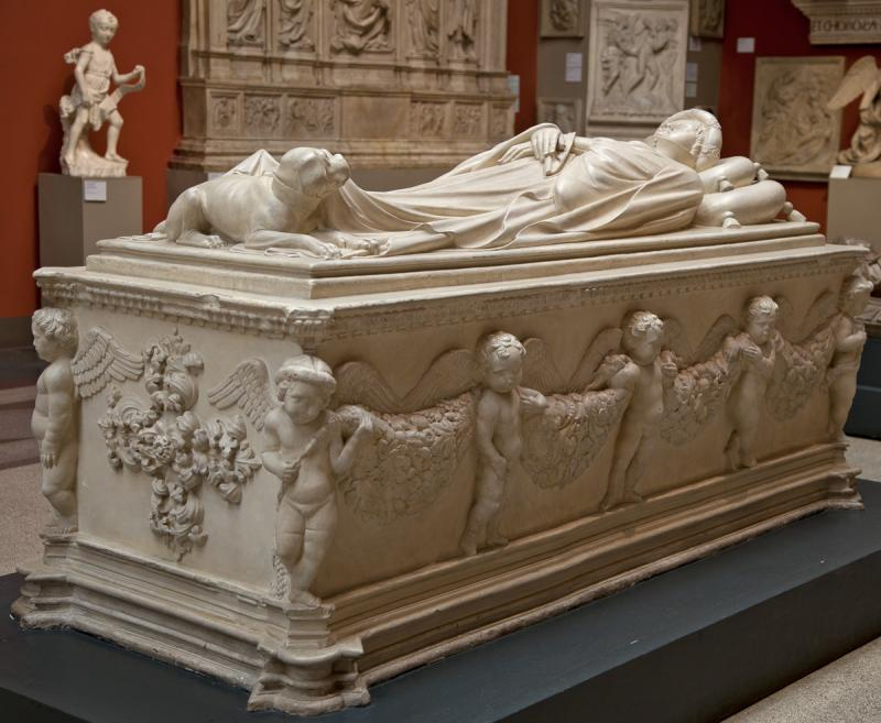 Великолепный мраморный саркофаг работы Якопо делла Кверча изображает дворянку Иларию дель Карретто, которая умерла в возрасте 26 лет в 1405 году после рождения второй дочери.