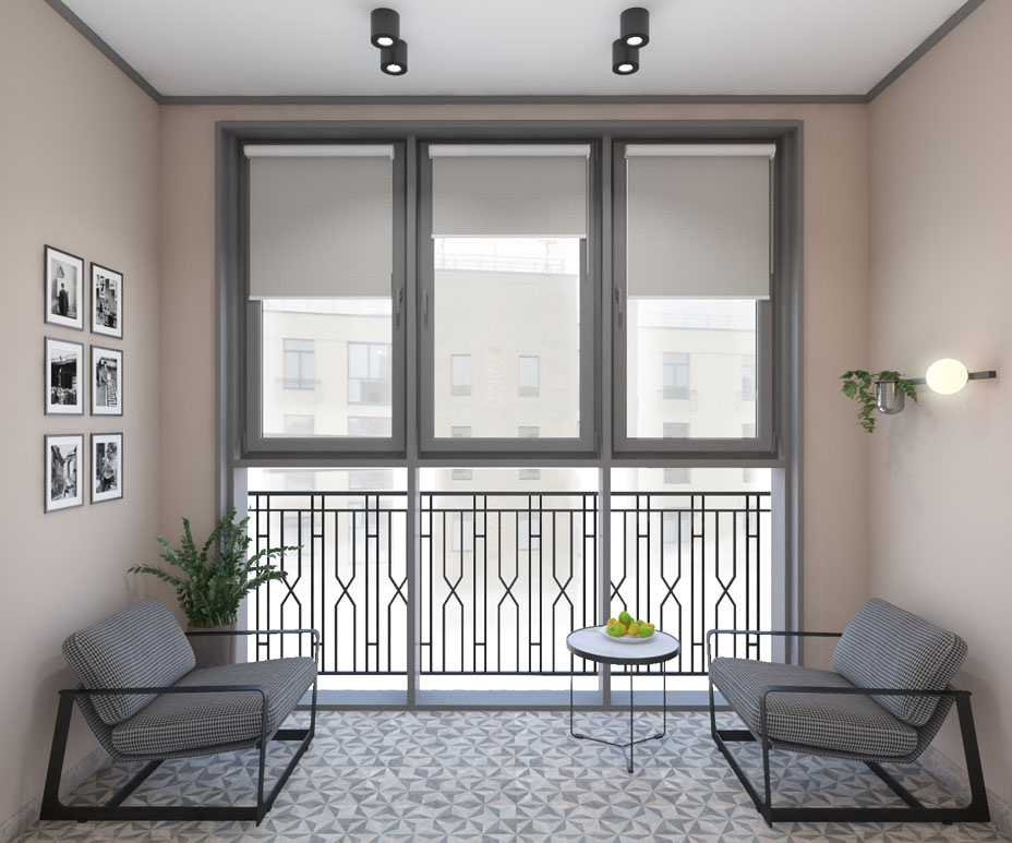 Лоджия с остеклением в пол и с выходом из кухни, продолжает интерьер комнаты как зона отдыха с двумя креслами и журнальным столиком. Пёстрый пол из керамогранитной мозаики поддерживает пёструю обшивку кресел, на фоне бежевого цвета стен. Настенный бра из белого шара придаёт уюта помещению в тёмное время суток. За основное освещение отвечают четыре потолочных спотовых светильника. В дневное время обилие света обеспечивают окна в пол. Уютное место с хорошим видом из окна.