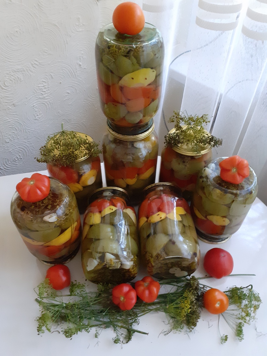 Для спасения урожая томатов я модифицировала рецепт заготовки зеленых томатов по модели ассорти. На однолитровую банку: Для маринада: Если сомневаетесь в том, что и как выглядит, напоминаю: Зеленые томаты помыли. Пополам «нарубили». Красные томаты берем для красоты и аромата, хвостики — отделяем, томаты — нарезаем. Чеснок молоденький берем и очень нужный вкус даем. Банки на 1 л промыть, дать стечь воде, стерилизовать в духовке 10 минут при минимальной температуре 130°C), на решетке, горлышком вниз. Выключить. Через 10-15 минут сухим полотенцем вынуть банки из духовки и поставить на сухую поверхность стола (можно на полотенце).