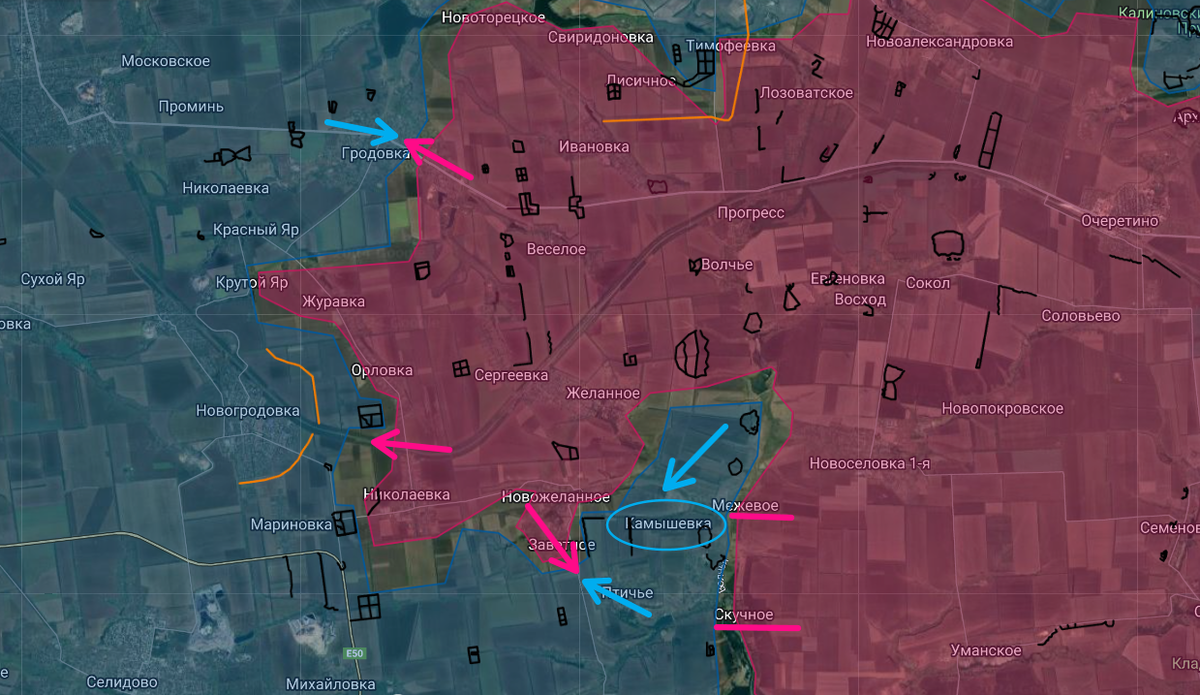 Южнее, после взятия Заветного, наши штурмовые группы начали давить в сторону Птичьего. Камышевка автоматически попадает в жёсткий мешок, из которого противник, наверняка, в ближайшее время драпанёт. На данный момент он уже уходит из опорников севернее. Межевое и Скучное тоже были оставлены врагом из-за невозможности дальше держать оборону в этих н.п.