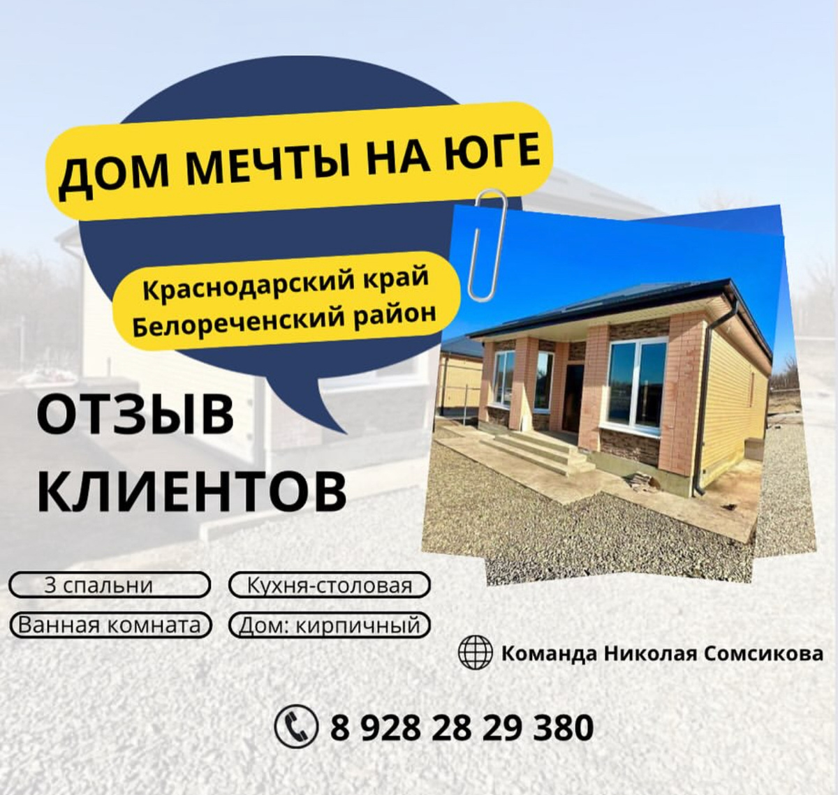 Наша команда помогла Ольге и ее семье из Забайкальского края в приобретении недвижимости от застройщика на расстоянии Сначала наши покупатели хотели купить себе домик для жизни в Ростовской области. Но увидев именно этот дом который расположен в Краснодарском крае, Белореченском районе, п. Заречном. Ольга и ее семья очень заинтересовались данным домом. ‼️ Для них мы сняли очень подробный видеообзор этого дома и отправили ей по закрытой ссылке где смогли просмотреть все уточняющие детали Самые главные детали которые были важны для Ольги это ⬇️ - более подробно про комуникации: горячая и холодная вода в ванной и кухне - проверьте все ли окна функционируют - розетки и выключатели сделаны или нет - можно ли открыть чердак и посмотреть - септик открыть - измерить примерно (шагами ) расстояние до предполагаемого забора со всех сторон дома И конечно же после просмотра отснятого подробного обзора, Ольга и ее семья были в восторге, ведь это оказался их дом мечты! Приехав вместе с