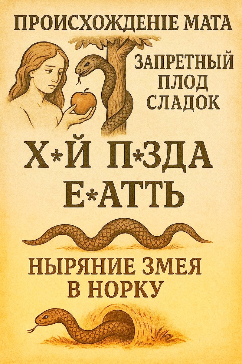 Происхождение Мата. Запретный плод сладок и мат -это хлёстко, кратко, ёмко, ясно. Весь русский мат целиком и полностью происходит с языков финских народов т.н. мордвы(Мокша,Эрзя) и означает Ныряние Змея в Норку, Гнездо или Дупло и это факт, а всё остальное наповерку невыдерживающая никакой критики дешёвая подтасовка с разных языков аля Хвоя, Хвост, Писать и т.п. Вся триада т.н. русского мата и плюс слово мат логично объясняются только с языков т.н. мордвы(Мокша,Эрзя), т.е. 4 попадания из четырёх, пазл собран полностью, с других языков такого сделать нельзя. Мат нельзя произносить потому, что основа его совсем не русская. Само слово Мат происходит от мокшанских слов: Матт- ложись или погасни, Маттэ- уложу или погашу, Матыма- укладывание или угасание, Матымат - укладывания, угасания. Сюда подходит выражение про Укладывание или Обкладывание трехэтажным Матом. Слово Маты на мокшанском звучит как СотныМат, что в ином значении означает "Завяз