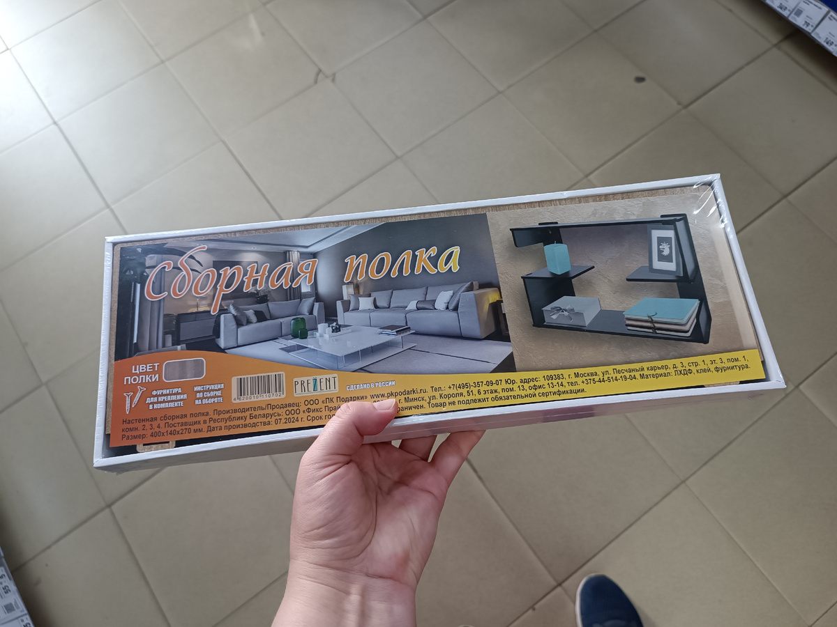 Приветствую! Опять много новинок завезли в магазин, есть интересные и стоящие товары, к которым многие будут присматриваться. А я покажу их во всех ракурсах, насколько это возможно. Начну с отдела для интерьера. Тут пока еще шкафов нет ))), но из мебели очередные полки завезли. И не одинарные доски, как раньше, а именно целые конструкции. Упаковка тяжелая, вот так вылядит: Сама полка в сборном виде должна получиться вот такой, как на этикетке: описание показываю, все запечатано, вскрыть упаковку не получится. Но размеры тут на этикетке тоже написаны: Все в коробке, основательно запечатано. Это хорошо с одной стороны, если не вскрывали покупатели, то и все запчасти на месте должны быть. Открыть даже оценить толщину досок нет возможности. Но постаралась отодвинуть этикетку и показать цвета. И кстати, там два вида полок... Вот эти два цвета - светлая (не белая) и темно-серая: Вторая конструкцию отличается от первой: Если поближе, то выглядеть должен так: Я не знаю, насколько прочная кон