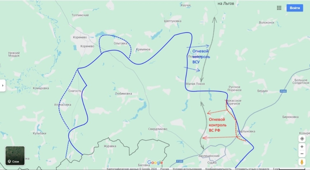 Здесь, как мы и говорили днем, противник попробовал расширить свое присутствие и попытаться закрепиться на новых позициях в районе Ольговки-Кремяной. Успеха не достиг. К сожалению, мы тоже пока не можем его выдавить из района южнее Кромских Быков. Противник уже успел здесь укрепиться. И очевидно, что дальше он будет пробовать продолжать здесь расширять свое присутствие, превращая занятую с наскока территорию в хорошо оборудованный плацдарм, с которого его будет трудно выбить. В районе Русского Поречного также была атака, но она была отбита. Не перестает противник пытаться занять Мартыновку. На самом деле здесь это ключевое село, без контроля над которым он не может себя чувствовать в Судже в безопасности. Но самое главное даже не это. Пока мы контролируем Мартыновку (как и район Русского и Черкасского Поречного), а значит можем с ее территории работать FPV-дронами, ВСУ не могут использовать в полной мере для логистики своих подразделений на Льговском участке, трассу Суджа-Льгов.