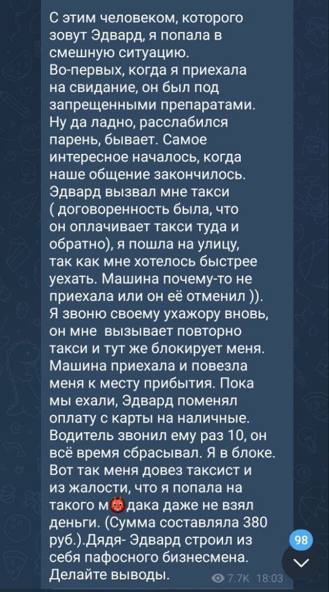 - «Договоренность была, что он оплачивает такси туда и обратно». Нет, вот реально есть дамы, обговаривающие это заранее?? Мне бы и в голову не пришло вообще спросить про такое.