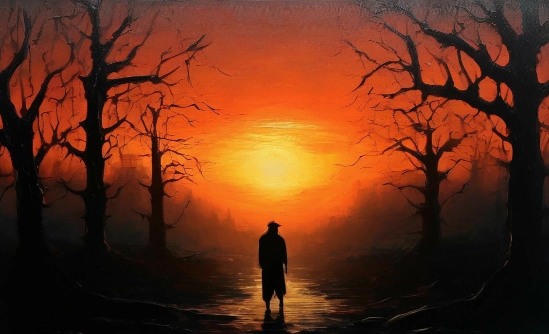 На окраине маленького городка, среди густых, мрачных лесов, стоял заброшенный дом. Его стены покрылись мхом, а окна были затянуты паутиной. Этот дом достался по наследству Алексею, который никогда не мечтал о наследстве, особенно таком зловещем. С детства он слышал легенды о доме, о том, что в нем творились страшные вещи, о том, как его предки исчезали без следа. Но долг перед семьей был сильнее страха, и Алексей решил провести выходные в этом зловещем месте. На чердаке, среди пыли и старых вещей, он наткнулся на картину, которая привлекла его внимание. Она была написана маслом и изображала мрачный пейзаж: закат, который выглядел как кровавое море, с черными деревьями, вырастающими из земли, как руки, тянущиеся к небу. В центре картины находилась фигура, окутанная тенью, с лицом, искаженным ужасом и страданием. Алексей почувствовал, как холод пробежал по его спине, но его любопытство взяло верх. После осмотра картины, он решил продать ее на аукционе, надеясь избавиться от тягостного