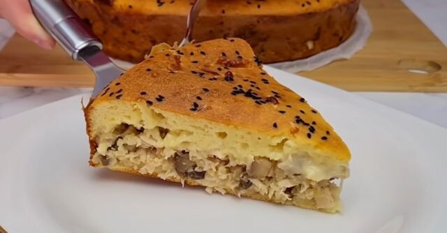 Вкусное и мягкое тесто так же получается и с использованием майонеза. И готовится так же просто. 🔥 Лучшее в телеграм: Посмотреть Ингредиенты: Способ приготовления: Шаг 1. Мелко нашинкуйте лук и обжарьте его в сковороде на разогретом растительном масле. Когда лук поджарится добавьте мелко нарезанные пластиками маринованные шампиньоны. Получится не менее вкусно если вы замените грибы капустой. Шаг 2. Когда выпарится влага и грибы поджарятся, добавьте соль, перец по вкусу. Шаг 3. Куриное филе отварите вместе с луковицей и морковью. Остудите и нарежьте филе на небольшие кусочки. Переложите к грибам и немного обжарьте, чтобы ингредиенты обменялись вкусами. Оставьте начинку остывать. Шаг 4. Для заливного теста возьмите три яйца. Разбейте их в миску, добавьте щепотку соли и немного майонеза. Влейте кефир. Взбивайте массу венчиком постепенно добавляя муку. В муку заранее добавьте пакетик разрыхлителя. Шаг 5. Дно формы закройте пергаментом, стенки смажьте сливочным маслом. На дно вылейте