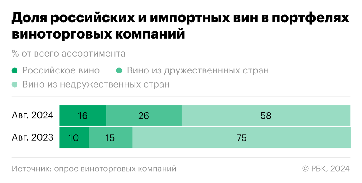 Вина из недружественных стран продолжают занимать большую часть портфелей крупнейших виноторговых компаний России, формируя в среднем 58% ассортимента вин, на «дружественные» вина приходится 26% ассортимента, а на российские — 16%. В августе 2023 года цифры были 75, 15 и 10% соответственно. С данными крупнейших компаний из сферы продаж вина в России, включая SimpleWine, Fort, AST, LADOGA и Luding, ознакомился «РБК Вино».