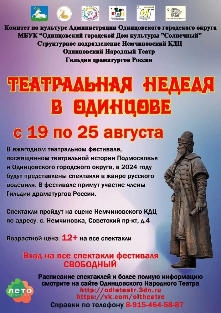 Привет друзья! Каждый год по мере возможности я стараюсь посещать это удивительное событие - Театральную неделю в Немчиновке. Главная особенность - это то, что каждый день в течение недели (в этом году с 19 по 25 августа) на сцене КДЦ играются спектакли, естественно разные и посещение бесплатное. За неделю можно познакомиться с разными жанрами (комедия, драма) и видами спектаклей (например моноспектакли), труппами и артистами. Тема 2024 года - русский водевиль. Итак, афиша в этом году выглядит следующим образом. Откроет театральную неделю экскурсия "По следам Зелёного театра", где вы из рассказа Светланы Лапшиной (руководителя Одинцовского Народного Театра) узнаете о " Зелёном театре" Василия Ивановича Никитина. Сбор группы у Немчиновского КДЦ, начало в 18.00, рекомендую взять удобную обувь. Когда: 19 августа в 18:00 "Любовь побеждает всегда". Театр "Двое". "Спектакль построен на реальных фактах и рассказывает о встрече двух творческих душ - артиста Александра Вертинского и его