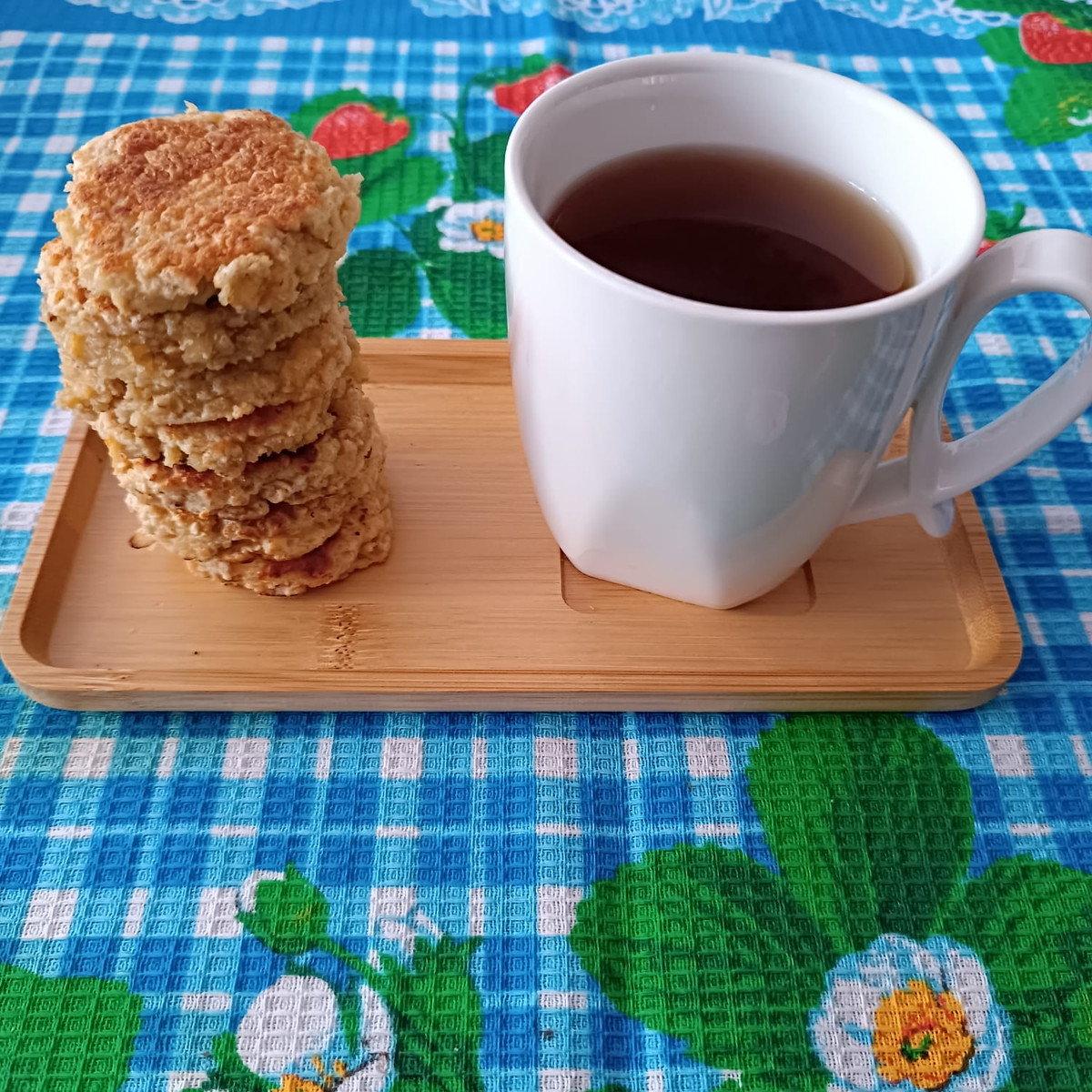 Разрыхлитель - 1/2 ч.ложки Творог размять, добавить муку, хлопья и яйцо, подсластитель и разрыхлитель, хорошо перемешать. Можно дать постоять, но не критично. Тесто не очень плотное, выкладывать ложкой на СУХУЮ сковороду - вот ещё в чём прелесть! Сковороду хорошо разогреть, выложить печеньки, убавит огонь до минимума и накрыть крышкой. У меня 2 из 6 на электроплите. Выпекать по 5 минут с каждой стороны, или перевернуть несколько раз. Ни одна печенька не прилипла ) Они мягкие, так что может это не печеньки, а пряники, например, или плю