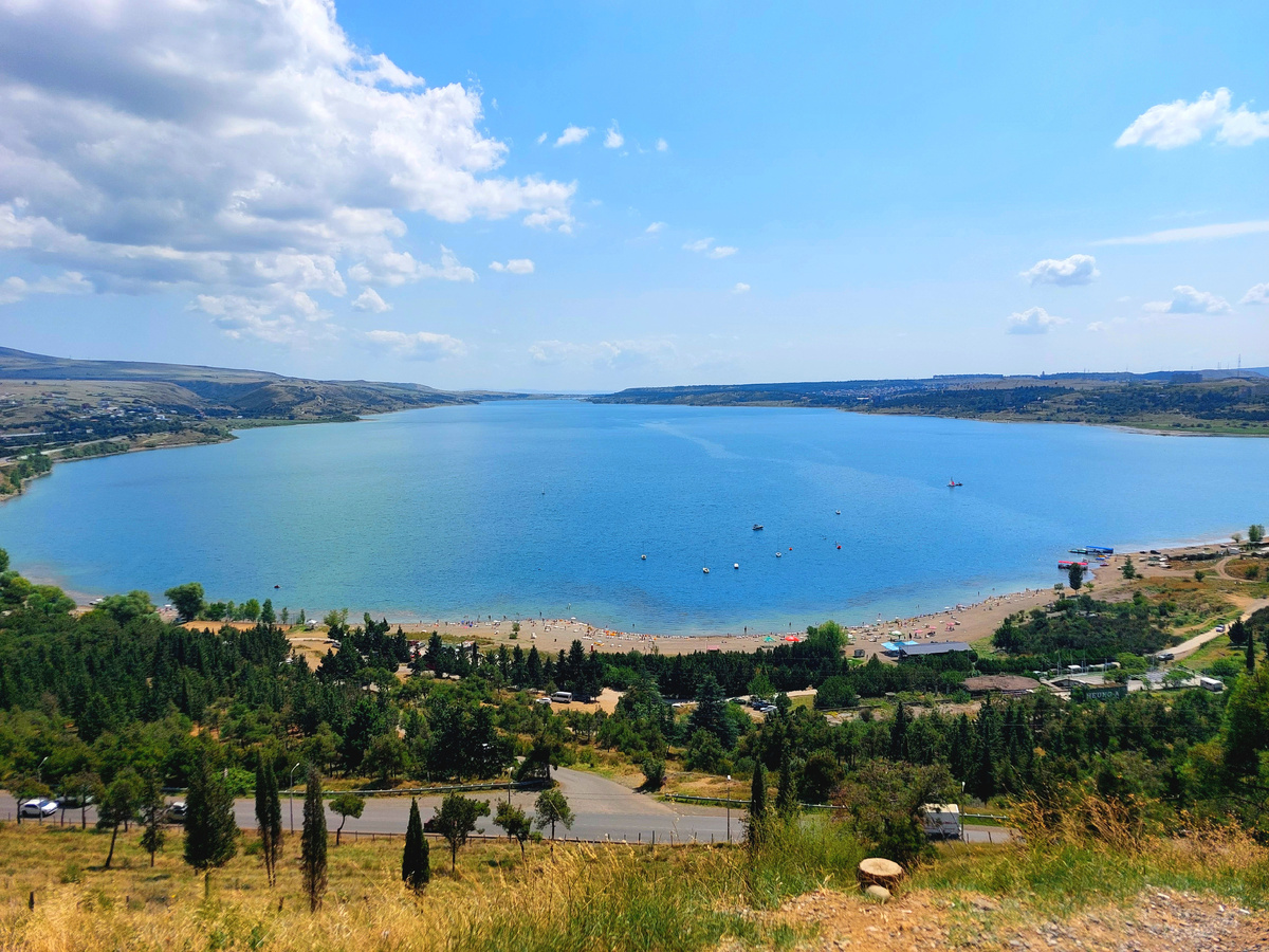 На его месте всего 75 лет назад была безжизненная степь и три маленьких горько-соленых озера👀 У столицы Грузии есть "море", точнее, это водохранилище, что не мешает тут отдыхающим чувствовать себя на настоящем море. Водохранилище создали в годы советской власти в 1952 году, затопив три горько-соленых озера водами большой реки Иори. На момент затопления вода в "море" оставалось солёной из-за маленьких озер, но потом опресневело. Использовали водохранилище в качестве орошения. Таким образом, степная местность стала пригодна для жизни, тут появились пастбища, дома, виноградники. На одном из берегов можно найти забытый памятник Самгорской оросительной системе, имени Сталина, разумеется. Тут есть зонты и шезлонги, ларёк с напитками и кафе. Туалетов и кабинки для переодевания замечено не было. Пляж мелкая галька, довольно колкая, детям лучше раздобыть специальные тапочки для купания. Также вдоль водохранилища расположился большой аквапарк Джино Парадайз. Там огромные горки. Стоим
