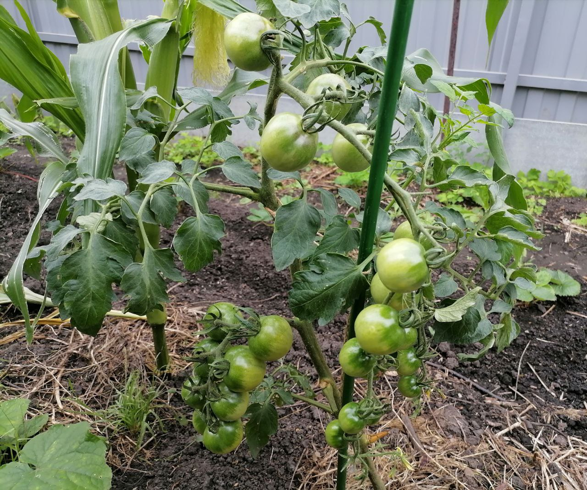 Конечно, не в Норильске живу, но и не на Алтае. Широта Новосибирска - Кемерово. У нас березы на несколько дней позже распускаются, чем в столице Сибири. Уже выращивала томаты без рассады посевом сразу в грунт. Ссылка на статью с итогами внизу этой публикации. В этом году холод, днем +10, по ночам заморозки, были до 5 июня. Зато июнь и июль выдались жаркими. Хотя температуры выше +30 тоже не способствуют росту и опылению. И вот в такой сезон у меня вырос томат самосевом. Смотрите, какой урожайный. Это я его еще прищипнула над второй кистью, чтобы успели вырасти помидоры. Сначала куст был очень пышным, на толстом стебле. Решила, что это мой любимый, самый ранний и холодостойкий сорт - Алпатьева. Но когда увидела длинные кисти, узнала по ним свои не менее любимые, тоже ранние и холодостойкие черри Киш-Миш красный. Плодоносят в ог с июля и до октября, переносят первые осенние заморозки. Кисть, как у черри, а размер томатов заметно больше. Верхняя кисть, над которой прищипнула, сначала за
