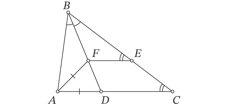 Выберите все верные равенства. 1. ∠AFD=∠ADF Да, потому что треугольник AFD равнобедренный 2. ∠EFD+∠FDC=180∘ Да, потому что сумма углов в четырехугольнике FECD равно 360 градусов. Угол E равен 180 градусов минус угол С, а значит в сумме Е+С=180 градусов, значит сумма 2х других углов тоже 180 градусов. 3. ∠BAF=∠ACB Тут что получается, раз угол Е, равен углу С, значит FE параллельна DC, а значит угол F равен углу D (душка и 2 черточки) а смежный ему угол две душки и черточка. Треугольник AFD равнобедренный, значит углы у основания равны и при этом они равны тому самому смежному углу. Переходим к треугольнику ABF. Угол F это смежный для угла при основании треугольника AFD, а значит это уже до боли нам знакомый угол душка и 2 черточки. Теперь смотрим на треугольник BFE - тут тоже есть углы с одной душкой и душкой и двумя черточками, при этом третий угол получился 2 черточки, значит и в треугольнике ABF угол А это две черточки. Вот так и получилось что ∠BAF=∠ACB 4. FE=FA Равенство выполняет