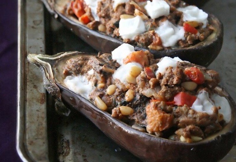 - Лодочки из баклажанов наполните овощной смесью и сбрызните оливковым маслом.