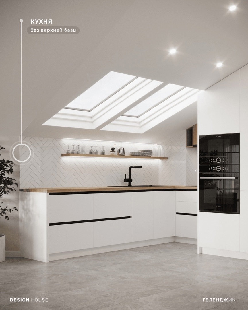 Закончили проект квартиры для сдачи в мансардном этаже. В проектировании кухни, при скошенных потолках, возникает необходимость переноса верхнего уровня шкафов.
