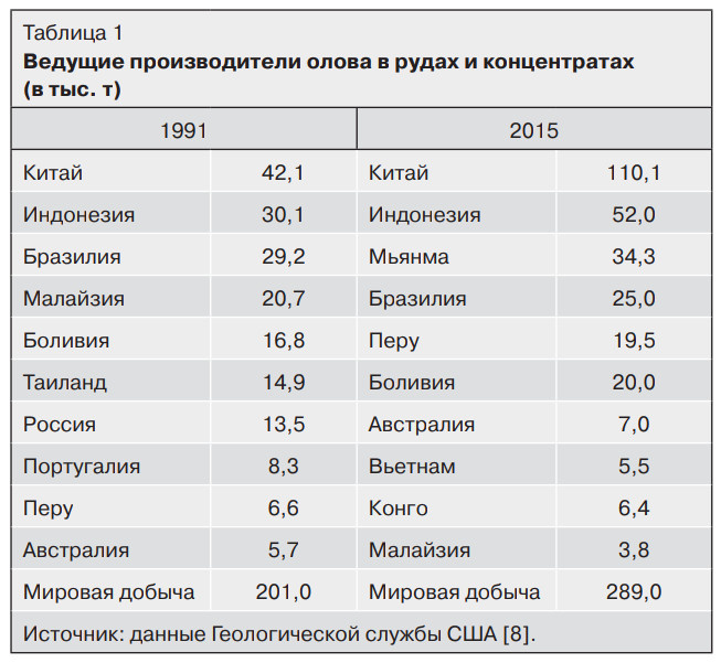 Оловянная промышленность России до сих пор не восстановилась свой потенциал, который был утерян в результате разрыва производственных и хозяйственных связей после распада СССР.