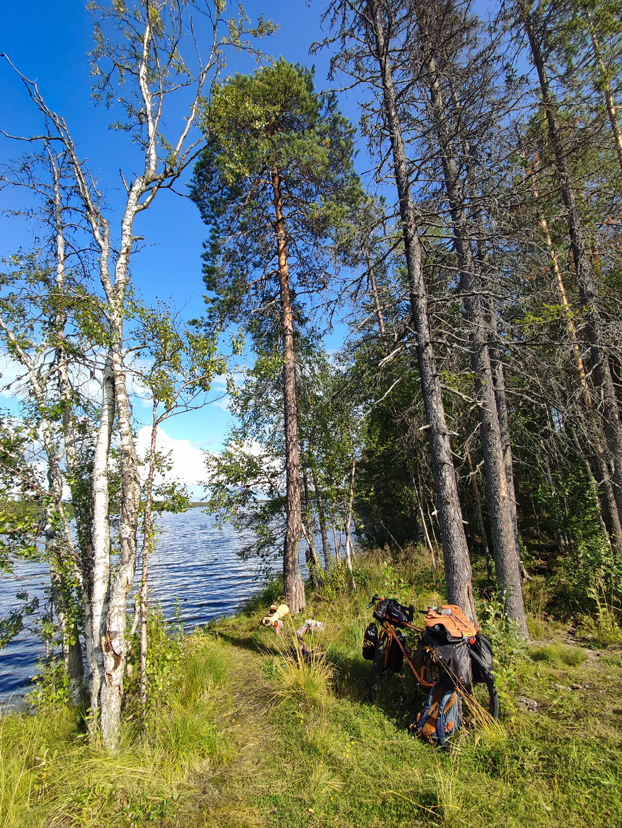 За всё время моего нынешнего путешествия мне всего пару раз удалось избежать просушки палатки. Сегодняшнее утро не пополнило копилку исключений. По обыкновению я выношу все вещи и складываю их на пенку, а палатку складываю и выворачиваю наизнанку и оставляю на сухом солнечном месте. Пока она сохнет фасую вещи по сумкам. Одну укладываю таким способом, чтоб продукты с перекусом, газовая горелка, баллон и нож были вместе на случай обеда. Дальше сумки развешиваю на велосипед с уже смотанной палаткой. Ветер сегодня немного ослаб, а может остался только на верхах, потому как дорога стала набирать глубокий рельеф. Изломилась и дымчатая черта горизонта. Ко второй половине, появились скалы и снова окреп лес на них, а болота встречаются реже. Иногда в перерывах я подпираю велосипед к дереву, а сам захожу в лесную чащу, чтоб набрать в пышном настланном всюду ковре несколько горстей черники. Ягода эта нравится мне умеренной сладостью и мелкими хрустящими косточками. Черника растёт и у на