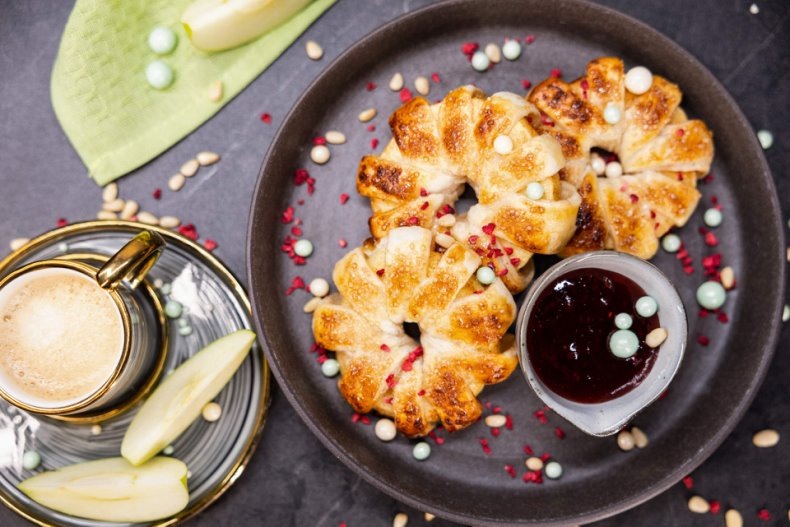 • Сублимированная малина — 3 г 1. Очистите яблоки от кожуры и нарежьте кольцами толщиной в 1 см. Аккуратно вырежьте сердцевинку. 2. В миске смешайте белый и коричневый сахар с корицей. Тщательно вотрите в яблочные кольца полученную смесь. 3. Сделайте подпыл из муки и выложите заранее размороженное слоеное тесто. Раскатайте его скалкой в пласт толщиной 5 мм. 4. Сверните слоенное тесто в рулет и нарежьте на ровные полоски толщиной около 7 мм. 5. Обмотайте яблочные кольца полосками из нарезанного теста так, чтобы фрукты остались видны. 6. Застелите противень пергаментом. Выло