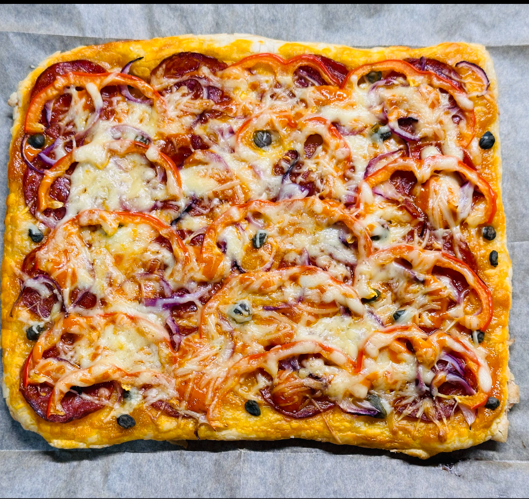 Всем привет друзья. Сегодня мы будем готовить пиццу. Нам понадобится: Тесто соленое дрожжевое. Колбаски (можно пепперони, но подойдут любые) Кетчуп (2-3 столовых ложки) Красный лук Сыр Болгарский перец Итак. Для начала берём и раскатываем слоёное тесто в один лист Затем кладём лист на немного смазанный растительным маслом противень и мажем тесто кетчупом. И выкладываем колбаски, красный лук, перец. Можно добавить корнишоны Затем трёп кусок сыра (я обычно тру целый кусок из магазина, так как люблю много сыра в пицце. И посыпаем нашу пиццу И отправляем на полчаса в духовку на 180 градусов. Наша пицца готова. Приятного аппетита! Подписывайтесь на канал