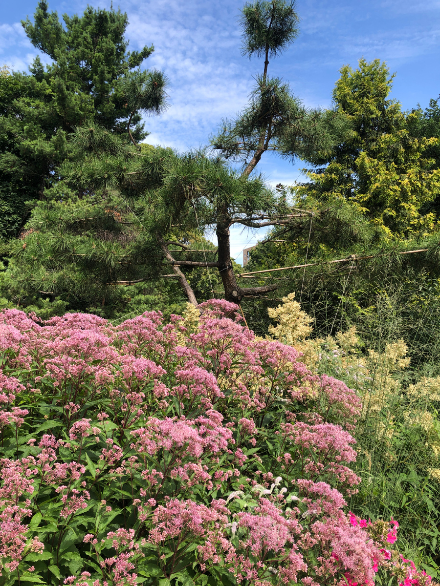 Два года назад посконник меня очаровал. Выразительное, современное растение, идеально вписывающееся в любой сад, особенно в сочетании со злаками или хвойными. А какой цвет! Приглушенный розовый, пыльный, деликатный…. Всё хорошо в посконнике, и цвет, и форма, и размер. Объем держит, не разваливается. Вырастает (в зависимости от сорта) чуть ли не в два метра! Впервые я разглядела это растение в Аптекарском огороде в Москве. Его пышные заросли на фоне хвойных сразу привлекли моё внимание. А как хорош посконник в сочетании с вероникаструмом виргинским! Вернувшись из путешествия, сразу приобрела несколько сортов. Популярный посконник пятнистый ATROPURPUREUM с раскидистой кроной, красными стеблями и розово-красными шапками соцветий, высотой до 1,8 м. И посконник коноплевый с листвой и светлыми пушистыми соцветиями, высотой до 1,7 м. Еще один чудесный посконник подарила мне Оля, автора канала "Сад в стиле Paradise", узнав о моем интересе к этому растению. Посконник пятнистый Purple Bush об