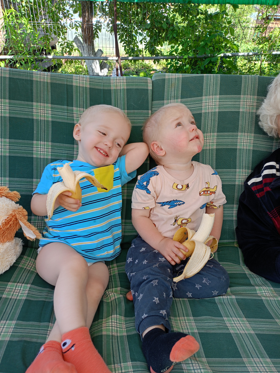 У них есть простенькие беговелы, и вот они катаются туда-сюда по дорожке на них. Особо их не понимают, но радуются тому, что у них есть «велосипеды», как у больших ребят!