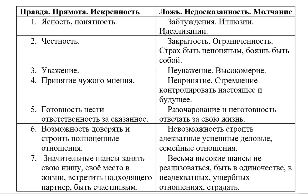 Предлагаю Вашему вниманию таблицу, по которой можно видеть позитивные последствия правды и прямоты в сравнение с негативами лжи, недосказанности и молчания. Таблица авторская. На примере этой таблицы каждый может наглядно, в режиме реального времени сравнить то, что он уже имеет в жизни, с тем поведением, которое было до таких вот результатов. Правдивый, прямой честный человек - это понятная личность. Даже еслли это враг, то это понятный враг, достойный уважения. Лживый, молчаливый, недоговаривающий человек - это всегда подозрительно, ненадежно, непродуктивно.