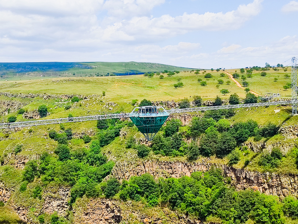 Всем привет, сегодня про новую достопримечательность - стеклянный мост над каньоном. В 2016 году каньон официально стал природным памятником Грузии, а в 2023 году здесь завершились работы по созданию туристической инфраструктуры. Стеклянный мост, протяженность 240м, построила Израильская компания Kass Land. Стоимость проекта свыше 40 млн. долларов США. Посередине моста расположен (висит) ресторан (кафе) в форме бриллианта. При входе есть также семейный ресторан и детская площадка. Виды на каньон с моста открываются красивые. Каньон представляет собой 8 км крутых склонов с густой зеленью. Есть сумасшедшее развлечение «торо-байк»: велосипед закрепляется сверху и снизу, ты едешь по тросу над каньоном параллельно мосту - это больше напоминает цирковое представление. По дну каньона протекает река Храми. Потоки подземных вод, которые вытекают из скалы в виде живописной хрустальной завесы изумрудного цвета, образуют каскад водопадов. Чтобы спуститься на дно каньона, надо пройти сначала по об
