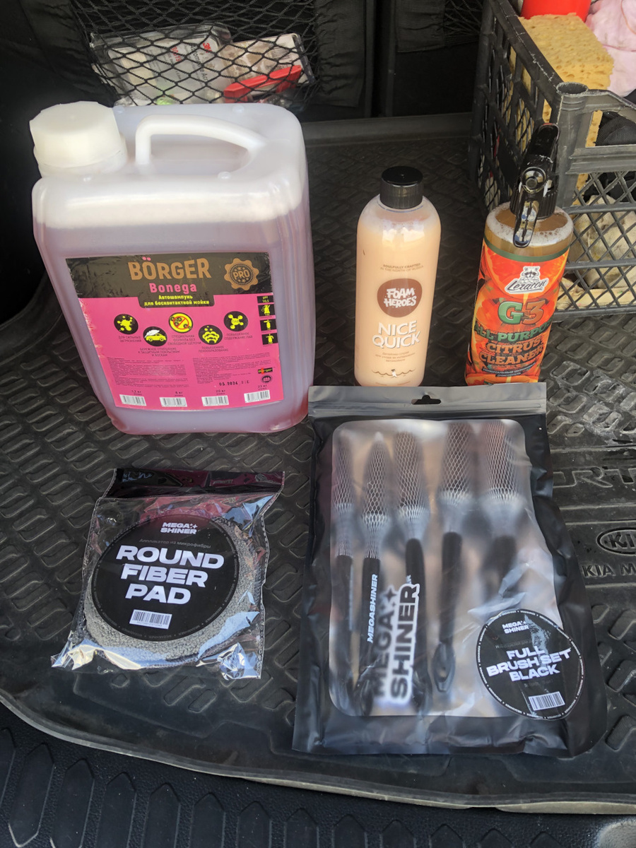 Всем привет друзья по драйву 2😉🙌 Сегодня небольшой обзорчик на приобретённую мною химию от sappo.ru/, ранее их продукцией уже пользовался и остались положительные впечатления и тем более химии много не бывает ))))) Ну приступим: В этот раз я приобрел такие составчики, на всякий прикреплю к каждой химии ссылочку Bonega — автошампунь для бесконтактной мойки 6 кг, Borger Nice Quick Milkshake, детейлер-спрей для интерьера 500 мл, Foam Heroes G3 Универсальный очиститель кузова 473 мл, Leraton А так же немного инструмента для интерьера Набор кистей для детейлинга с натуральным ворсом Full Brush Set Black, 5 шт, MegaShiner Аппликатор микрофибровый с карманом серый Round Fiber Pad, диаметр 12 см, MegaShiner А теперь приступим к мойке и натирке авто: Достаем наш чудо шампунь После решил немного опробовать апельсинку на дисках Шампунь отличный, пениться хорошо Далее немного детейлинга😁 В общем почистил все щели на панели, щеточкой, все получилось супер, а запах какой от него 😍 На этом заканч
