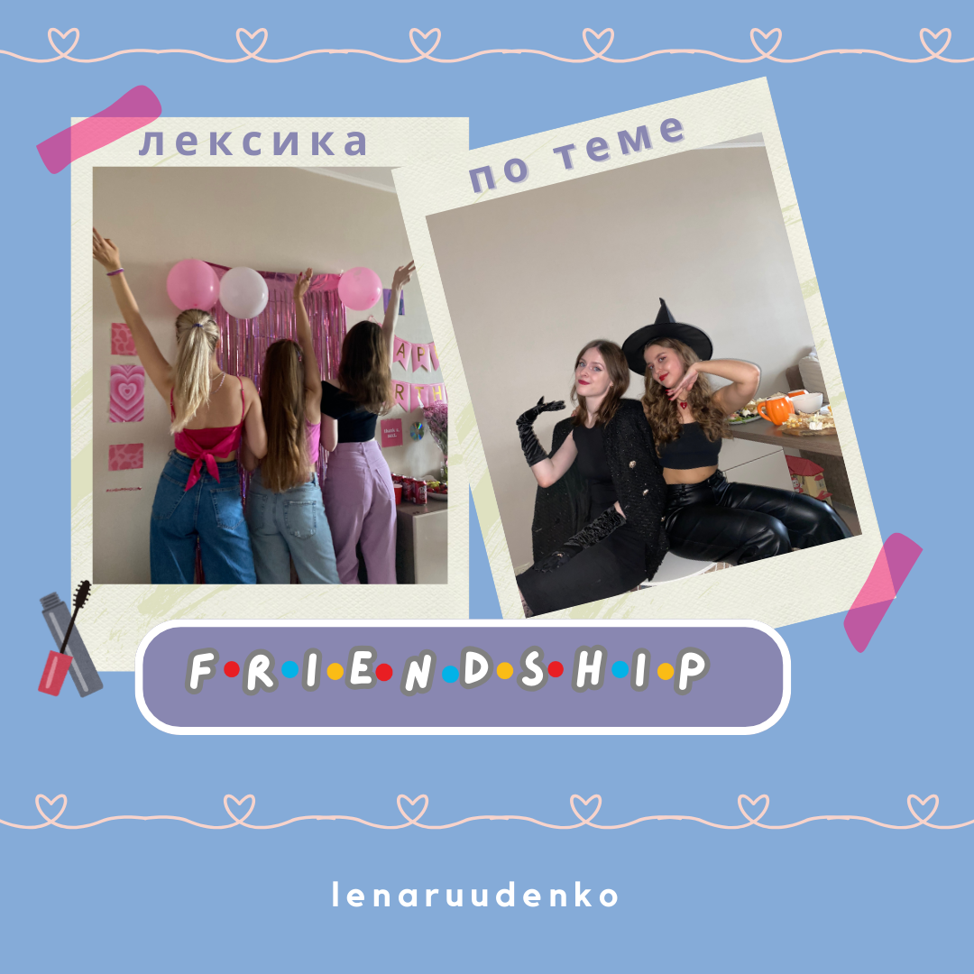 Всем привет! Я Лена Руденко, стобальница, победительница олимпиад и преподаватель английского, готовящий к ЕГЭ с 2021 года. Сегодня мы разберем интересные слова и выражения по теме friendship. глаголы: - to get on well with somebody - хорошо ладить с кем-то - make friends - заводить друзей - get to know each other - узнать друг друга - to hang out - тусоваться -to keep in touch - оставаться на связи -to stick together - держаться вместе - to share secrets - делиться секретами - to quarrel / to fall out - ссориться - to trust - доверять - to betray - предать примеры использования: - Does Tom get on well with his parents? - He doesn't make friends very easily. - Jane encouraged the guests to get to know each other. - I'd like to hang out with you for my whole life. - Mary and I never kept in touch after college. - The two brothers always stick together at school. - They share secrets, discuss something, or simply speak on topical issues. - She quarrelled with everyone in the village. - I