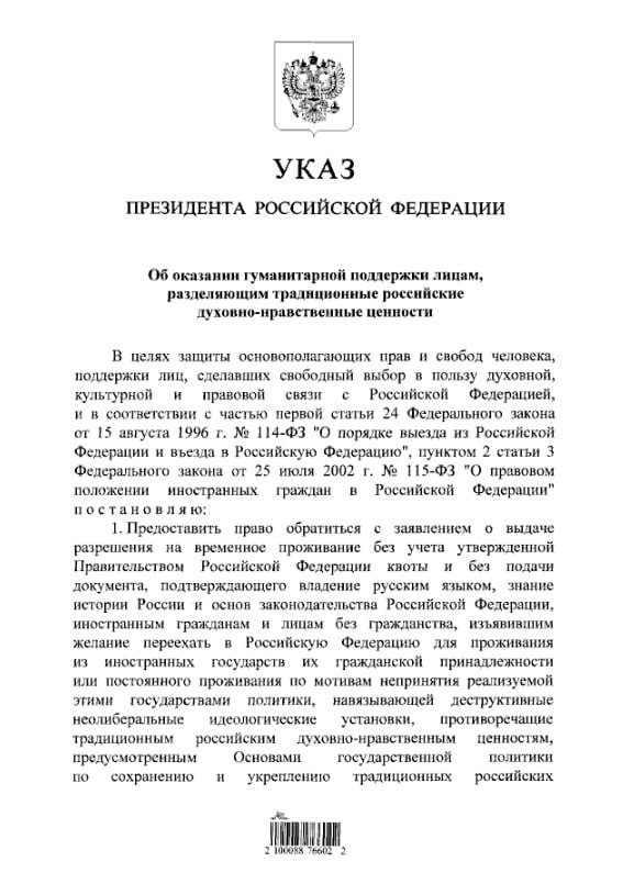 Согласно ему, лицам, которые поддерживают российские ценности, будет разрешено обратиться с заявлением о выдаче разрешения на временное проживание без учёта квоты и без подачи документа, подтверждающего знания русского языка и истории России, и основ законодательства РФ. Получается, что с одной стороны появляются новости об ужесточении для мигрантов, а он одним росчерком пера это все умножил на ноль? И где бы со списком "ценностей" ознакомиться?