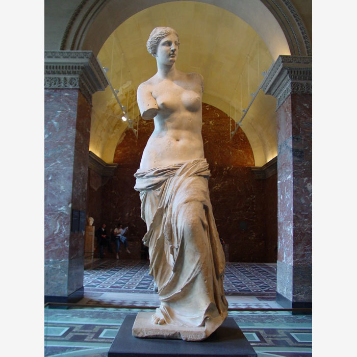 Венера Милосская – интерпретация эллинистической греческой статуи Александроса Антиохийского: Афродиты Мелосской, богини любви и красоты. Создана скульптура была, между 130 и 100 годами до нашей эры. Но открыли её, в 1820 году, на острове Мелос (Милос), одном из юго-западных островов Кикладской группы. Женская каменная скульптура была обнаружена в поле молодым фермером по имени Йоргос Кентротас. Она находилась в нише стены в руинах древнего города Милос. Статуя была разделена на две части: верхнюю часть туловища и ноги, покрытые драпировкой. Рядом были найдены другие скульптурные фрагменты, включая отдельную левую руку и руку, держащую яблоко, а также основание с упоминанием скульптора по имени «… сандрос из Анхиохии на Меандре». Фермеру в восстановлении статуи помог Оливье Вутье, французский военно-морской офицер из французского флота, базировавшегося неподалеку. Когда стало известно о находке, второй французский офицер, Жюль Дюмон д’Юрвиль, сообщил об этом французскому консулу