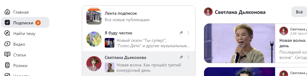 Первый тур, девятая группа. Наш конкурс продолжается несмотря ни на что. Ролики открываются не у всех или через раз, статьи тормозятся, но мы держимся. Для тех, кто смотрит публикации только в ленте, хочу дать подсказку. Можно открывать свежие статьи через подписки. С компьютера это выглядит так: С телефона так: Если для вас важны какие-то каналы, вы их можете закрепить. Тогда их свежие публикации будут постоянно для вас доступны в первую очередь, вы их не потеряете. Итак, начинаем с объявления победителя предыдущего выпуска. Им стала песня "Спасибо, родная", которую исполнил Михаил Боярский. Она набрала 34 голоса. игорь г.: Хотелось бы представить песню Вадима Цыганова, написанную для Вики Цыгановой. По мотивам рассказов о "Стреле Арримана". Замечательный клип вышел в 1994 году. Называется песня - "Любовь и смерть". С этого произведения открыл для себя Вику Цыганову. Александр не Great: Агата Кристи - "Как на войне". Записана в 1993 году. Автор музыки и слов Глеб Самойлов. Вошл