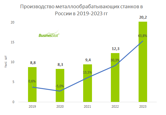 В 2023 г производство металлообрабатывающих станков в России выросло на 64%: с 12,3 до 20,2 тыс шт.