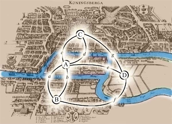 Кёнигсберг (ныне Калининград) был построен на берегу реки Преголя. Из-за этого получилось так, что город был разделен на четыре части – два острова и два берега реки. Для упрощения жизни жителей Кёнигсберга было построено семь мостов, каждый из которых соединял определенные части города. Существует легенда, что досугом горожан были попытки пройти весь город так, чтобы пересечь каждый мост только один раз. Но никто, кроме Леонарда Эйлера, так и не смог решить эту задачу или доказать, что это невозможно. Что именно сделал Эйлер и при чём тут топология? В 1735 году мэр соседнего города и по совместительству математик Карл Леонард Готлиб Элер обратился к Леонарду Эйлеру за помощью в решении этой задачи, которая уже много лет не давала покоя всем интересующимся. Изначально Эйлер, на тот момент прославленный и успешный математик, решил, что эта задача не достойна его внимания. Со временем его удалось убедить, и тогда Эйлер понял, что эта задача относится к на тот момент неизвестному типу мат