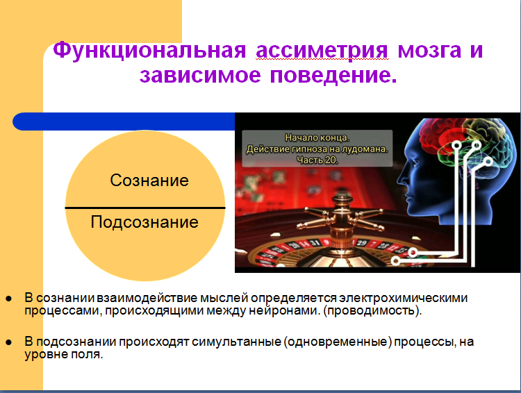 Алкоголь, табак, наркотики, лудомания на физическом, психическом, энергетическом уровне не одинаково действуют на оба полушария коры головного мозга. При равном физическом уничтожении нейронных связей синапсов в двух полушариях, подобные зависимости блокируют, закрывают, угнетают именно правое полушарие мозга! (например, 30 мл. этанола – на 18 суток) Даже изредка выпивающие люди являются биороботами, которые бездумно выполняет заложенные социальной средой в их левое полушарие программы – работают, учатся, воспитывают, заботятся, руководят, принимают законы и прочее, не в состоянии задать себе вопрос: для чего? Зачем? Кому это нужно? Что может понять в зависимом игровом поведении лудоман, даже изредка употребляющий, например, алкоголь или табак?