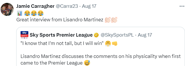 После перехода Лисандро Мартинеса в «Ман Юнайтед» Джейми Каррагер не переставал критиковать аргентинца. Скаузер настаивал на том, что Лича слишком низкий для центрального защитника Премьер-лиги. Лисандро заглянул на прямой эфир Sky Sports после победы «Ман Юнайтед» над «Фулхэмом» в первом туре АПЛ. Вместе с Каррагером в студии работали Гари Невилл и Рой Кин. В какой-то момент речь зашла о критике роста аргентинца. Тогда Джейми подошел к Личе и осознал: они практически одного роста. «Я всегда верил в себя и свои способности. Знаю, что я невысокого роста, но у меня есть решимость добиться успеха. Я буду проявлять индивидуальность и характер в борьбе за каждый мяч, в каждом противостоянии. Я докажу, что заслуживаю свое место на поле», – ответил Мартинес. Джейми оценил настрой аргентинца: «Отличное интервью Лисандро Мартинеса!» Позже Каррагер поменял аватарку в твиттере на фотографию с Личей. Джейми вообще любит подтрунивать над собой в соцсетях. Скаузер часто меняет аватарки и всегда выби