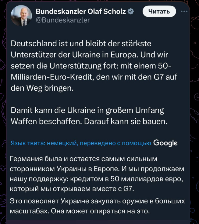 Сначала Горбачев сносит берлинскую стену, потом выводит войска из Германии, миротворец этакий, а сегодня я вижу, что НАТО стоит практически как фашисты стояли на тех же рубежах в 1943 году, ни одного фрица при этом не положивши. Наши войска по праву стояли на той земле, эта цена за гибель 27000000 советских граждан В подкрепление моих слов скрин немецкого канцлера Олафа Шольца. Этот плешивый клоун уже ни раз был замечен в русофобии, в оправдании нацистских преступлений путем перекладывания ответственности , например, про то что Германия более не испытывает исторической вины, в контексте после 24 февраля 2022. На данный момент, Германия занимает лидирующие позиции по поставкам оружия украинской хунте. В бочке дегтя, ложка меда… Мало, кто столько сделал для возрождения русского духа, как плешивый канцлер. Мы уже действительно уверовали, что мы друзья, однако нет, видимо урок который вам приподнесли наши деды - вы забыли, на вашу беду - а мы нет! Ах да, вернемся в начало девяностых. Аме
