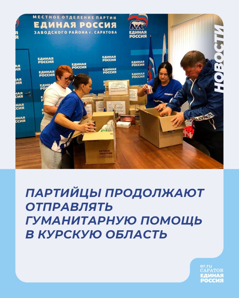 Пункты сбора гуманитарной помощи работают во всех местных отделениях партии «Единая Россия». 🇷🇺Активисты проекта «Женское движение Единой России» совместно с депутатом Саратовской городской Думы Сергеем Агаповым, исполнительным секретарём местного отделения партии «Единая Россия» Заводского района Оксаной Ениной, собрали и подготовили очередную партию гуманитарной помощи для жителей Курской области. 💬«Сегодня мы все объединились, чтобы помочь жителям Курской области, оказавшимся в беде. Мы будем и дальше оказывать поддержку пострадавшим жителям, а также нашим бойцам на СВО. Каждый желающий помочь может принести в пункты сбора необходимые вещи», - отметил депутат Саратовской городской Думы Сергей Агапов.