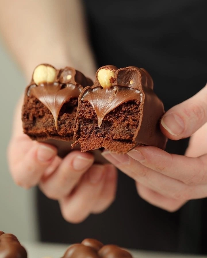 На форму 40*30см Рецепт не расчитан на точное количество пирожных, размер пирожных и количество орехов и карамели сверху вы можете регулировать на ваш вкус 😉 ✅ШОКОЛАДНЫЙ БИСКВИТ: На форму 40*30см - 2 яйца - 170г слив масла - 250г сахара - 60г какао-порошка - 240г кипятка - 180г муки - 5г разрыхлителя - 2г соли 1. Залить какао кипятком, остудить до 30 град. 2. Мягкое масло взбить с сахаром и яйцами, добавить муку, разрыхлитель и соль, перемешать и тонкой струйкой влить заваренное какао, вымешать тесто. 3. Выпекать до сухой шпашки при t=170град. ✅КАРАМЕЛЬ «Тоффи»: - 127г сахара - 33г воды - 127г сливок 33% - 112г слив масла 82,5% - 22г темного шоколада - 20г желатиновой массы (220 Блум) - 1,5г морской соли 1. Из сахара и воды сделать карамель, деглазировать горячими сливками, добавить соль, масло и шоколад, пробить блендером. 2. Стабилизировать в холодильнике 4-6 часов. ✅ШОКОЛАДНАЯ ГЛАЗУРЬ: - 200г темного шоколада - 200г какао-масла (можно заменить н