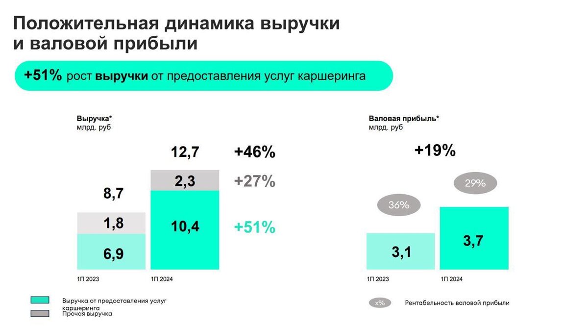 Ранее мы с вами разбирали довольно убедительные операционные показатели за первое полугодие 2024 года лидера каршеринга в России - Делимобиля. Теперь пришло время рассмотреть и финансовый отчет. Итак, выручка от предоставления услуг каршеринга увеличилась на 51% до 10,4 млрд рублей. Аренда автомобилей привлекает людей разных возрастов и социальных групп, а рост численности населения городов-миллионников создает благоприятные условия для развития сектора. Со слов компании, рост с опережением собственных прогнозов, но и ожиданий рынка. Каршеринг не только упрощает передвижение внутри городов, но и стимулирует поездки между ними, способствуя развитию внутреннего туризма. Это особенно актуально в период трансформации туристических потоков. Кроме того, каршеринг является альтернативой личному автомобилю и другим видам транспорта, позволяя экономить время и деньги. Одной из важнейших метрик в каршеринге является парк автомобилей, так как успех на рынке во многом зависит от возможности операт