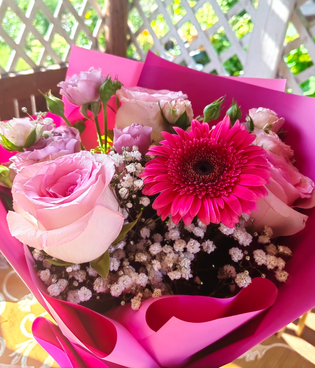 Получив прекрасный букет и подарки, я решила провести свой праздничный завтрак в одиночестве. Поэтому унесла букет в беседку и вернулась туда с кофе и бутербродом. Испытала массу удовольствия от своей незатейливой трапезы. Погода солнечная и очень теплая.